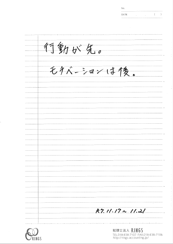 今週のことばは「行動が先。モチベーションは後」。これはキングコング西野亮廣さんが講演等で語った考え方で、やる気に頼らずまず動くことで結果や実感が生まれ、そこからモチベーションが育つという意味です。待っていても現実は変わらず、行動こそが突破口となります。私たちの業務でも、完璧な準備やタイミングを求めるより、小さな一歩でも先に着手することで次の活力につながります。今週は「まず動く」を意識しながら、価値提供と改善のサイクルを加速させていきましょう。
