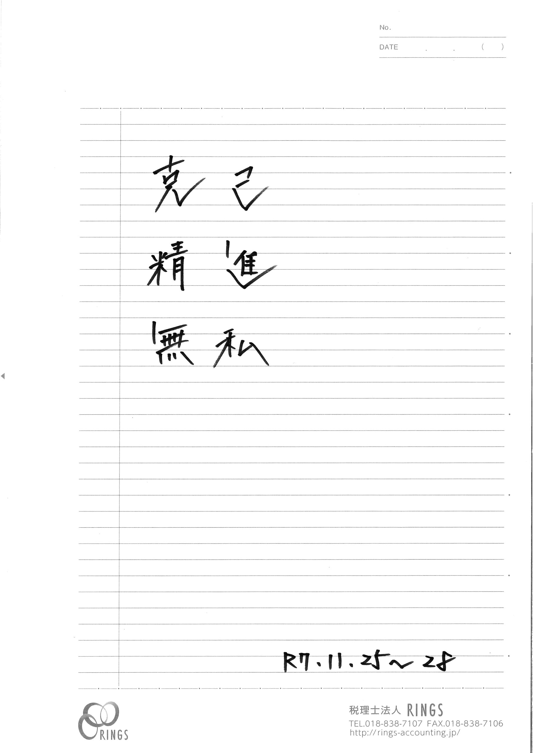 「克己」は、常に謙虚でいつでも利他を考え行動すること。「精進」は、誰しも持って生まれた性格が完全なわけではなく、後天的に素晴らしい哲学を身につけ人格を高めようと努力し続けること。「無私」は、自己犠牲を払う勇気。自分というものを横において物事を判断できる人になること。どんな状況でも謙虚に、自分の行いを日々振り返り反省しながら、時には自己犠牲も厭わない、そういった考え・姿勢が大切だと思い、今週の言葉としました。