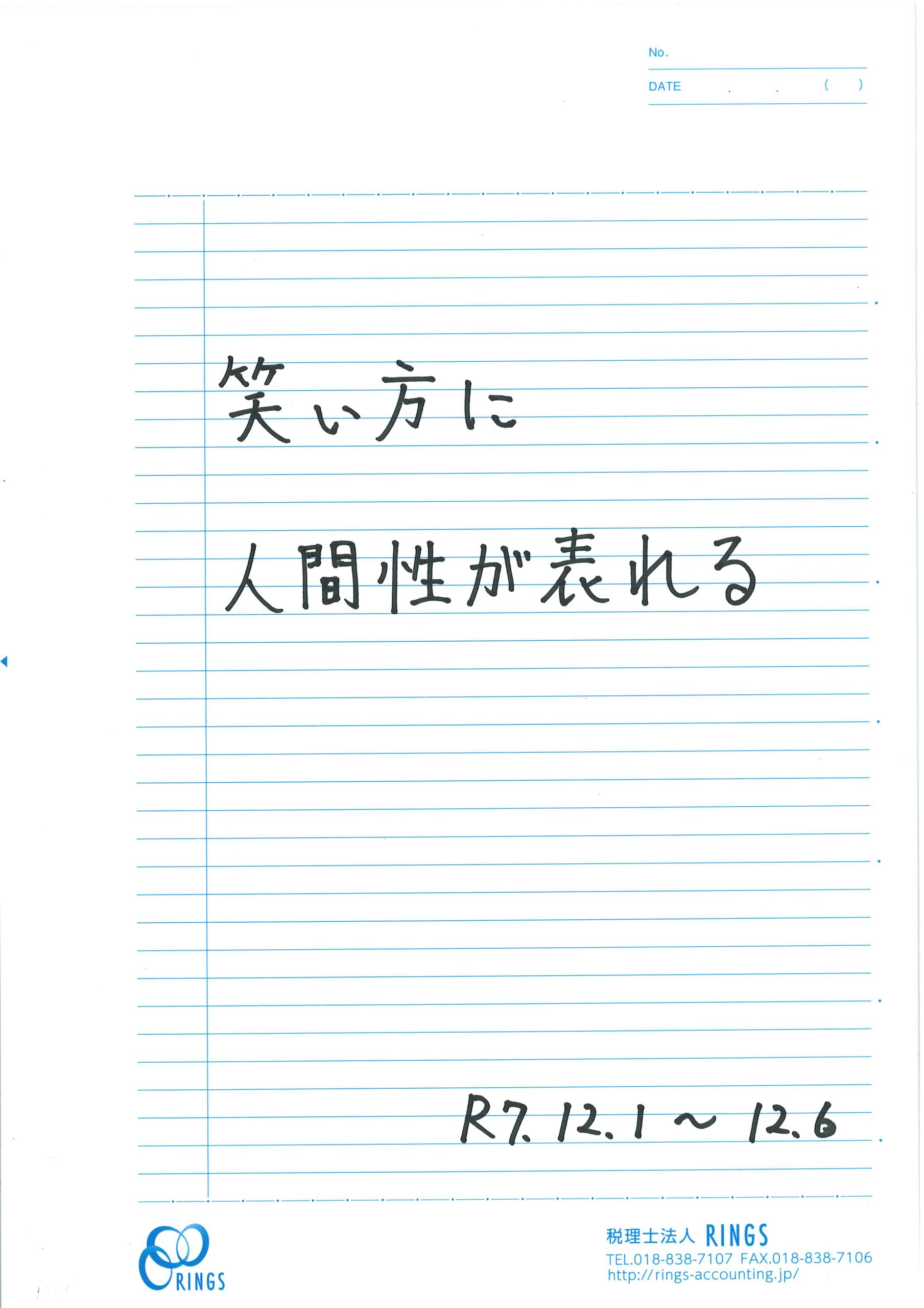 “どんなふうに笑うか。どんな場合に笑うか、そこには人間性がはからずとも表れている。さらに、笑い声の響き方に、その人の本性が漏れ出ている”と続いています。自分の笑い方について考えたことはありますか。笑いは無意識に内面から出てくるものだと思います。人は、いい表情で笑っている人に自然と目がいきます。まわりを和ませる楽しい笑顔で過ごしていきたいと思い今週の言葉としました。