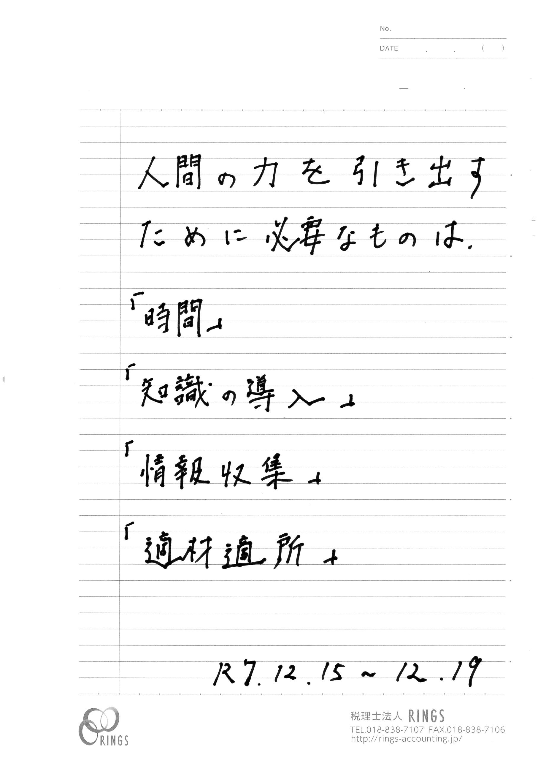 事務所としては、11月に合宿を行い個人目標の策定、そして先週は事務所の数値計画の策定を行いました。1月の発表会へ向けて個人目標についてはさらにブラッシュアップが必要ですが、今しっかり考えることによって来年充実した時間を過ごすことができると思います。目標設定と日々の振り返りを大切にしていきたいと思い今週の言葉とさせていただきました。