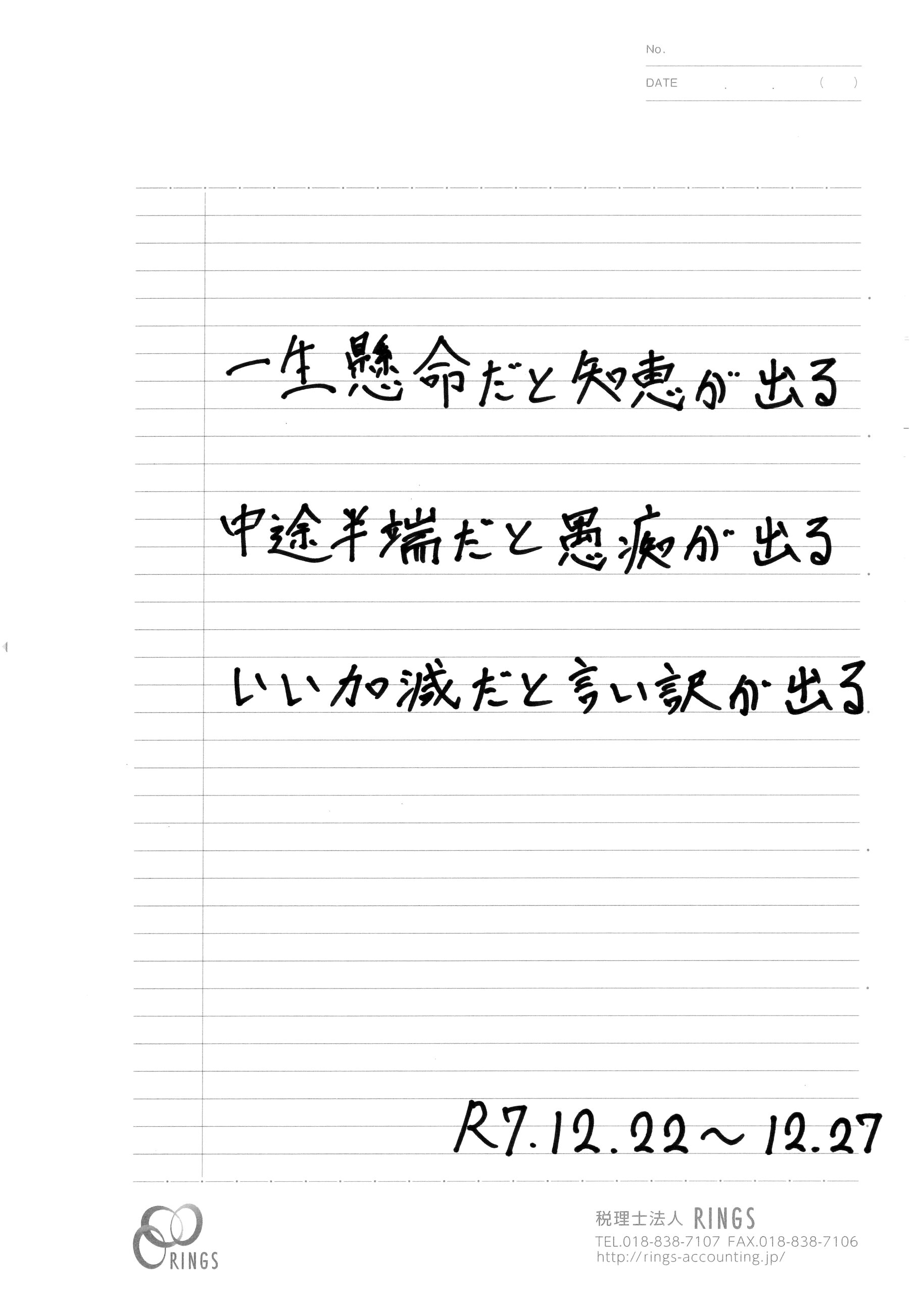 来年に向けては、この言葉を意識し、「どうすればより良くできるか」を自ら考え、主体的かつ全力で取り組んでいきたいと考えています。その決意を込めて、今週の言葉といたしました。